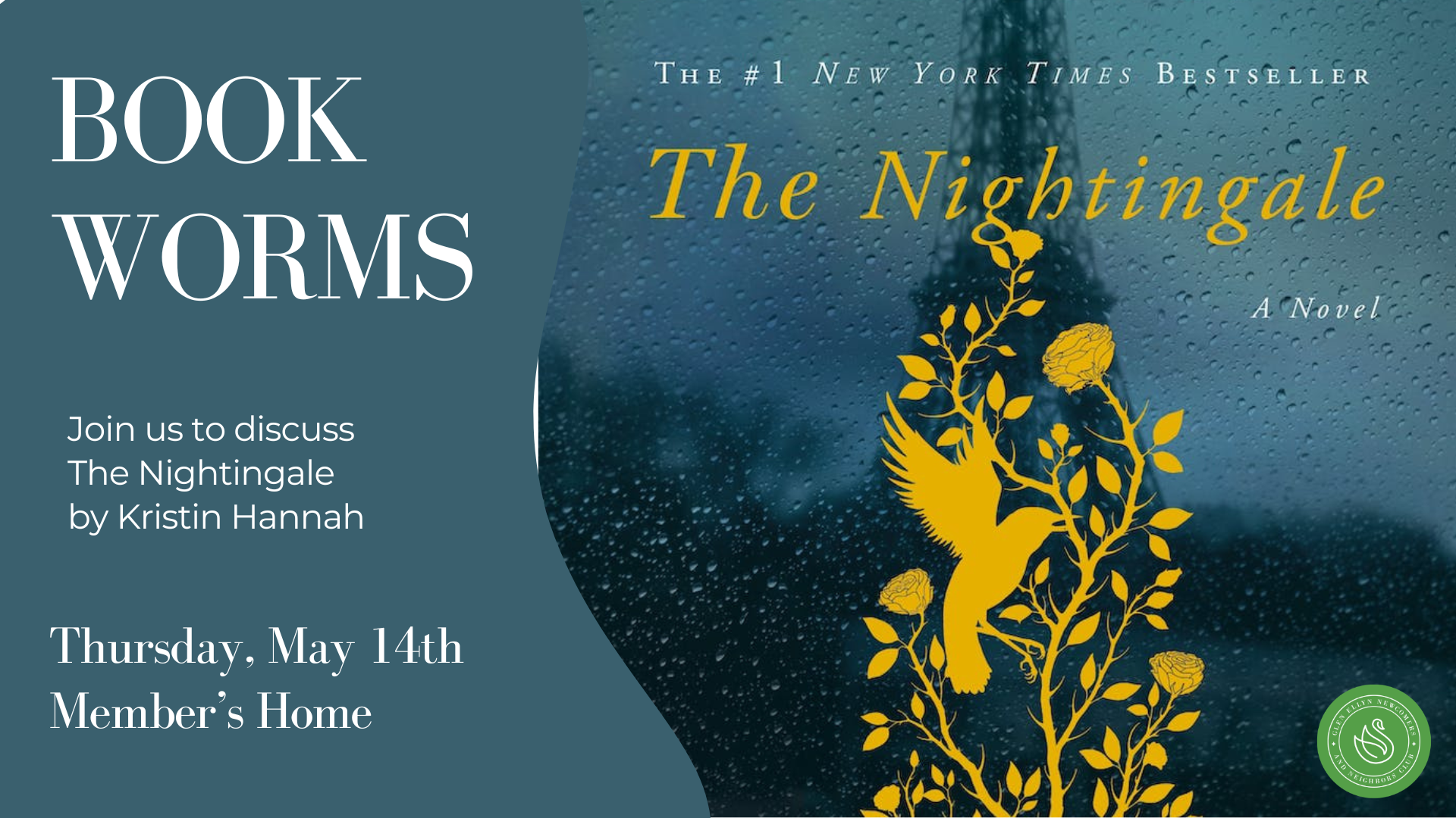 Please join us for our May Bookworms meeting at a members home to discuss our May book pick. Address will be sent out 24 hours in advance to those who RSVP. Please bring a bottle of wine, appetizer, or dessert to share.